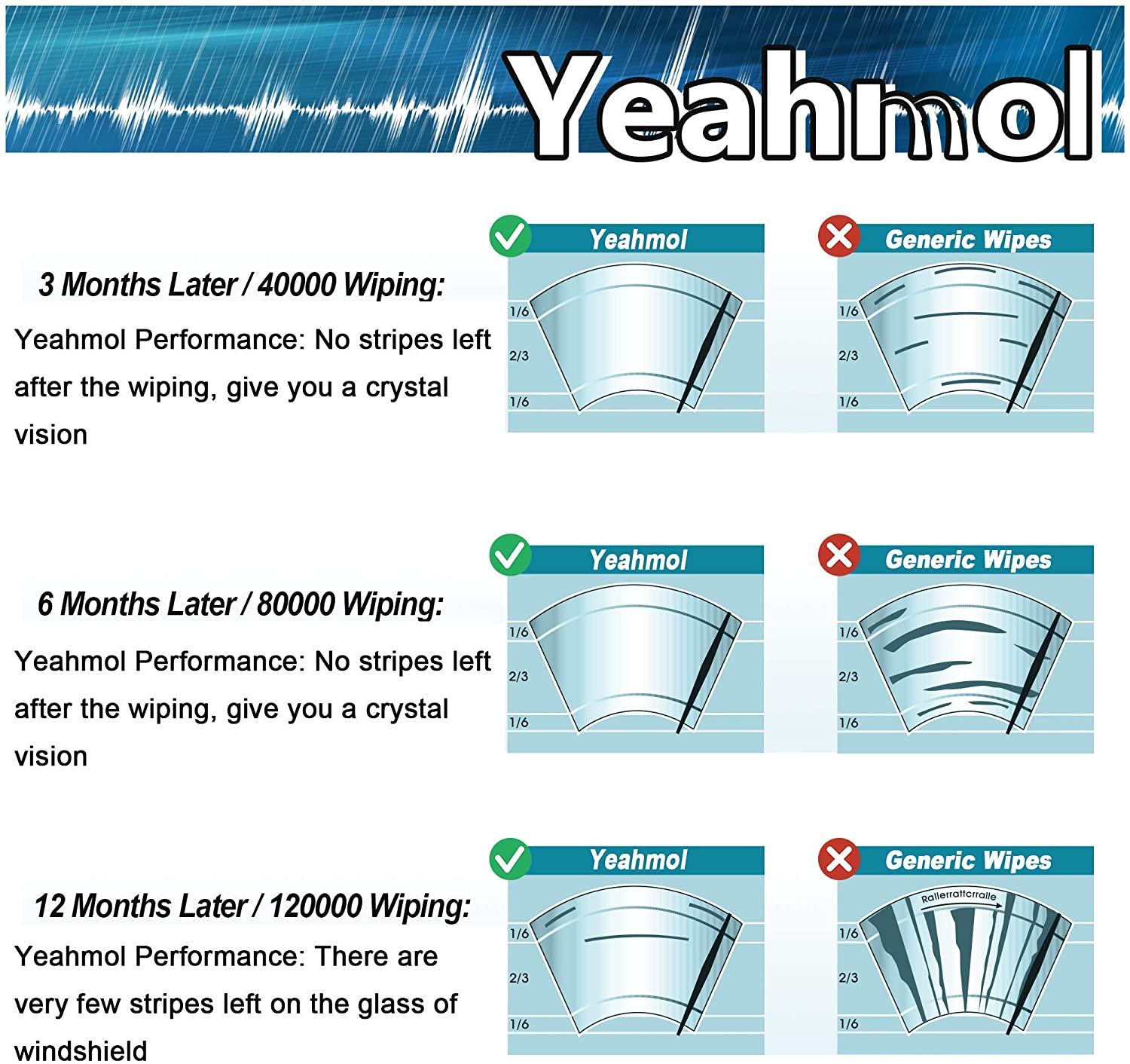 0 STREAK COMMITMENT: three section hybrid style wiper reduces drag, keeps wiping stable. The natural rubber material of the wiper blades is tightly attached to the windshield, without leaving any gaps, sweep away the rain, 180 degrees without dead angle£¨Attention: pls take the blade's protector cover off!£©